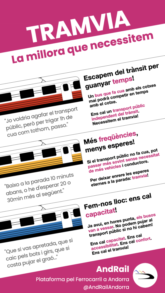 Implantar un vial de transport públic al centre d'Andorra requerirà, o bé l’eliminació del trànsit a motor de determinats carrers, o bé fer infraestructura nova (nou carril) pel transport públic. Posats a fer això perquè passin busos, posem els raïls i que hi passin trens!